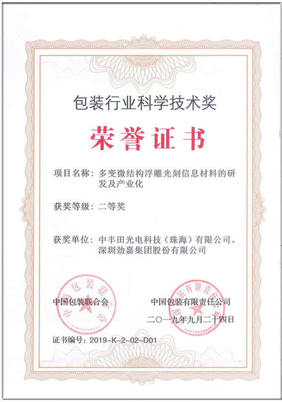 光学材料研究所目前设立创意设计、光刻制版、工艺研发和化工实验中心四个版块。先后研发推出水晶浮雕、多通道3D动态、真彩色图像、激光隐藏防伪和多变微结构等新光刻技术,同时研发出新型无溶剂复合、UV转铝复制、冷烫后印刷等新工艺新材料。其中多变微结构浮雕光刻技术的研发荣获“2019年中国包装行业包装科学技术进步二等奖”。